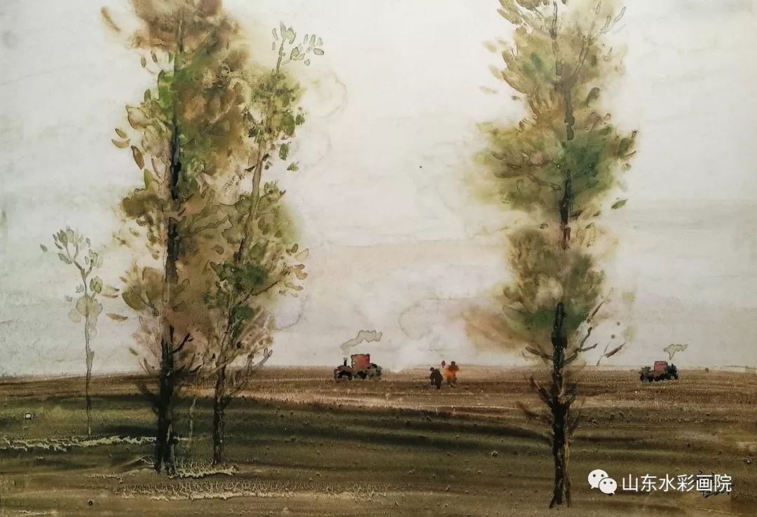 作品《晨曲》以树为主体以简取胜,通过画中点景人物营造出温暖的情境,意趣跃动在水彩的透脱感之中,观之清新爽快。而在绘秋色的几幅作品上,用色则绚烂至极,给人强烈的视觉冲力,大大强化了秋色之美。